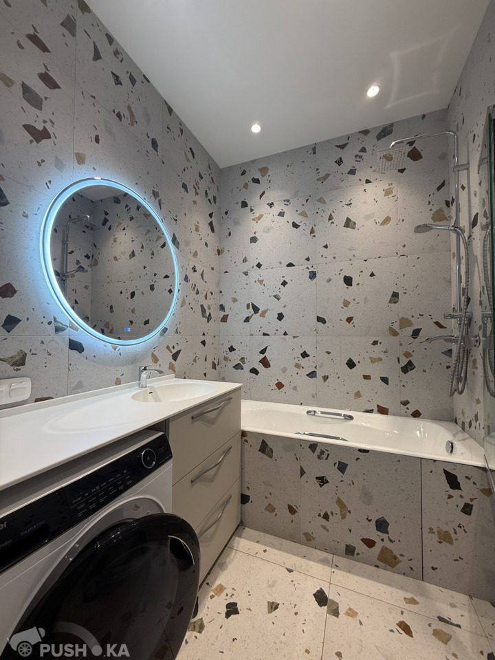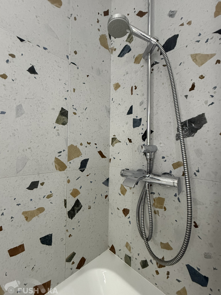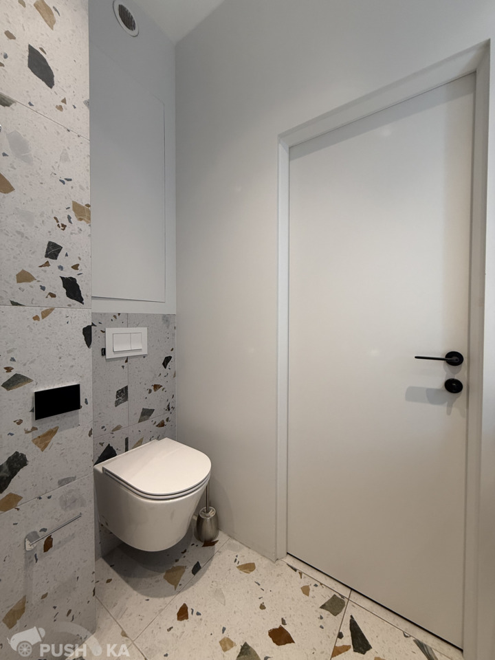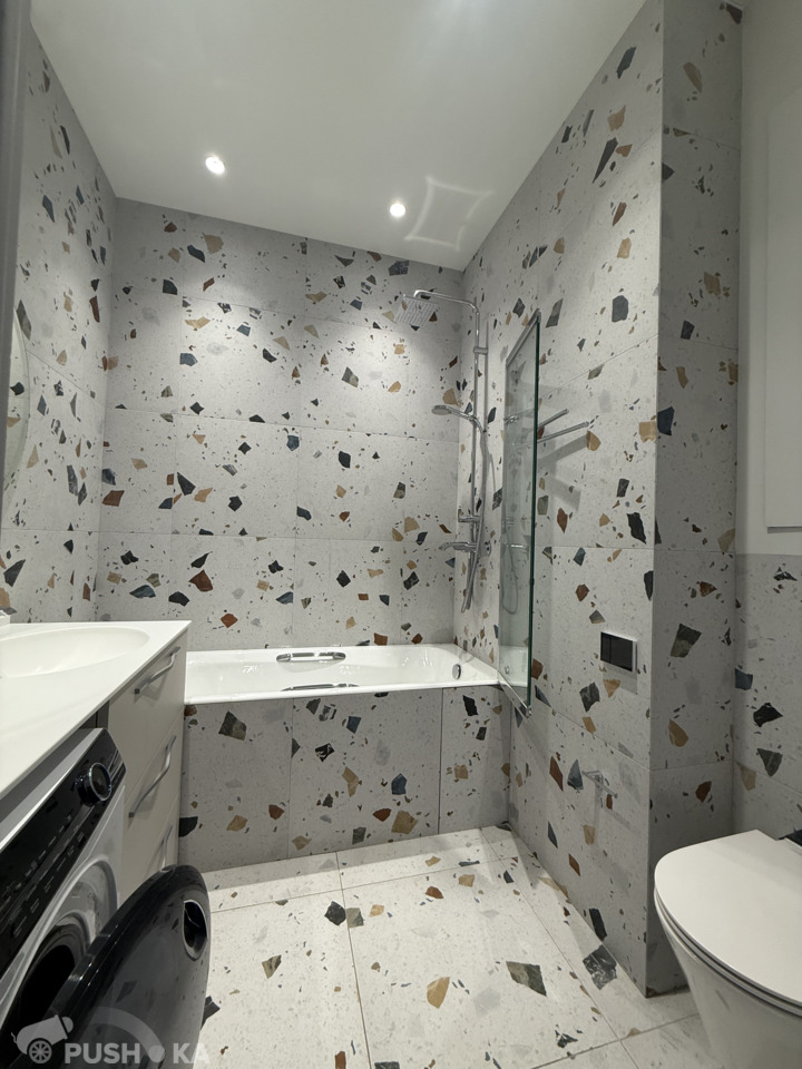 • Совмещенный санузел: чугунная ванна и инсталляция Jacobs Delafon, смесители Hansgrohe, система протечек Нептун.