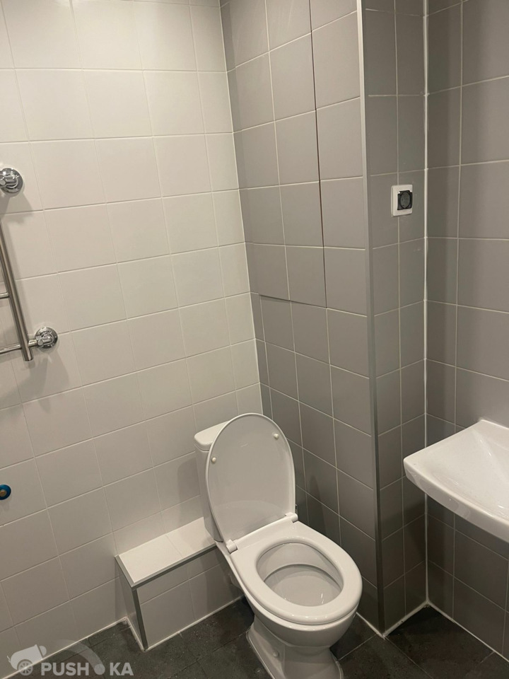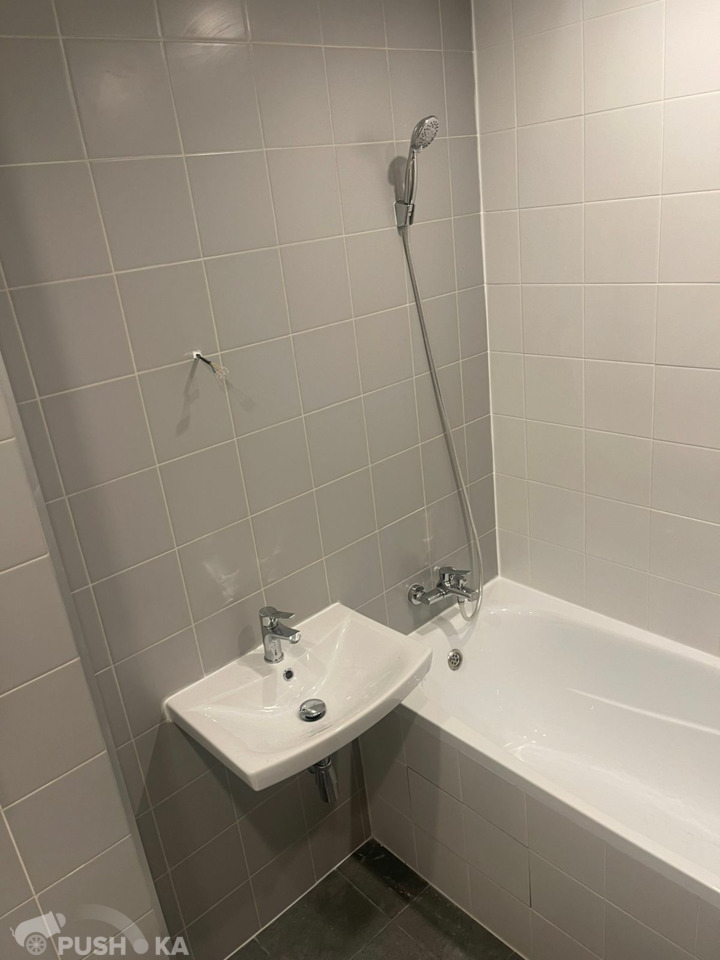 Балкон остеклен. Санузел совмещенный в плитке до потолка.